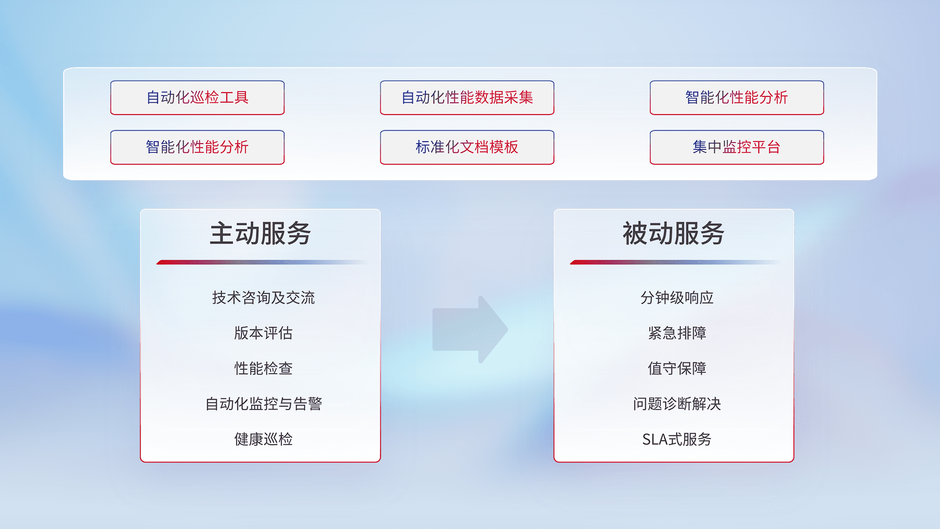 智能化工具和标准化文档,,,,保障服务质量,,提供主动服务(包含技术咨询、、、版本评估、、、性能检查、、、自动化监控与告警、、、健康巡检)和被动服务包含(分钟级响应、、、、紧急排障、、、值守保障、、、问题诊断解决、、SLA服务)。。。。